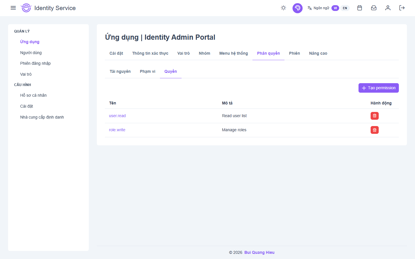 - Quản trị tập trung: Application, User, Role, Group, Resource, Scope, Permission